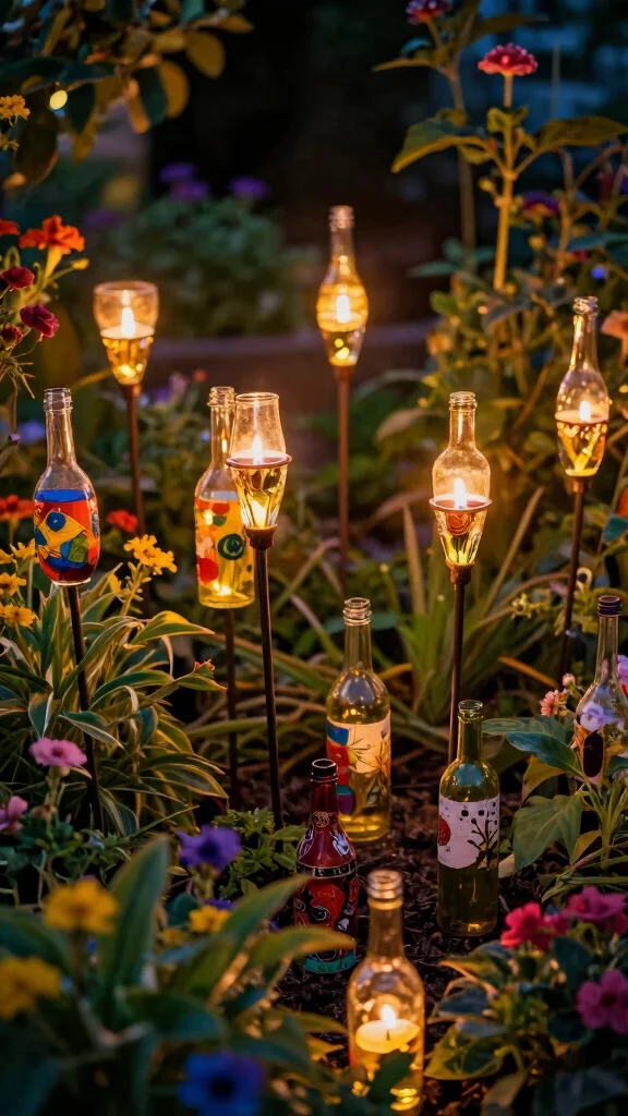 Get creative by crafting torches from recycled bottles, turning this eco-friendly DIY project into a delightful garden feature. Use wine bottles, glass jars, or old lanterns filled with oil and a wick to produce stunning designs that light up your space.