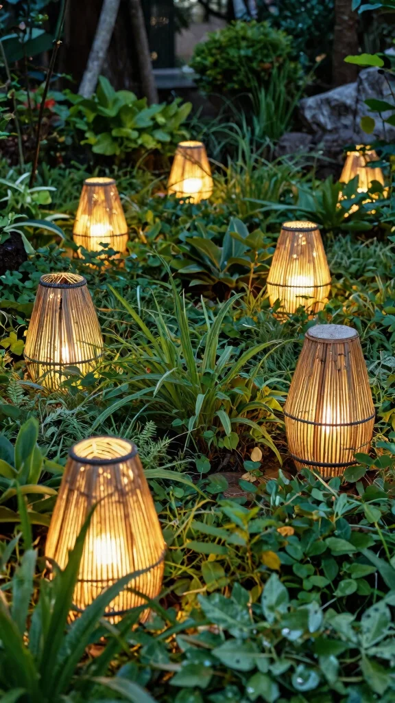 Answer: Pair lighting with natural and recycled materials for a cohesive look. Consider bamboo or reclaimed-metal fixtures that blend with greenery, integrated step lights, and hidden uplights that cast soft silhouettes of plants.