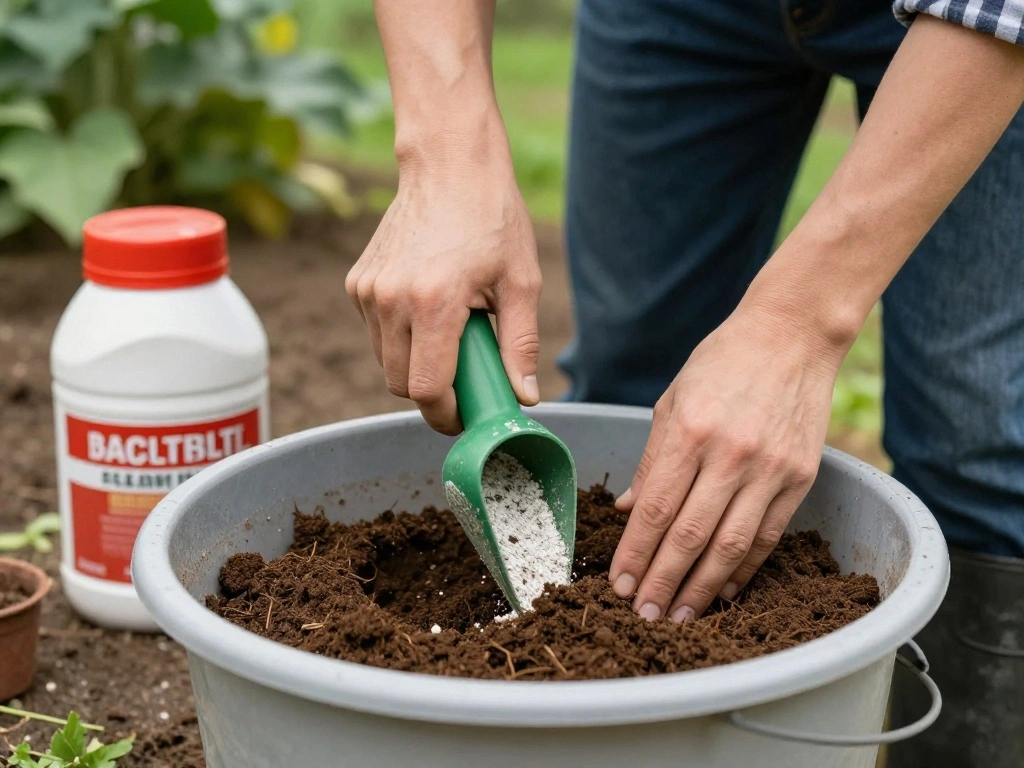 [Image Prompt: Show a gardener mixing potting soil and fertilizer in a bucket or container.]