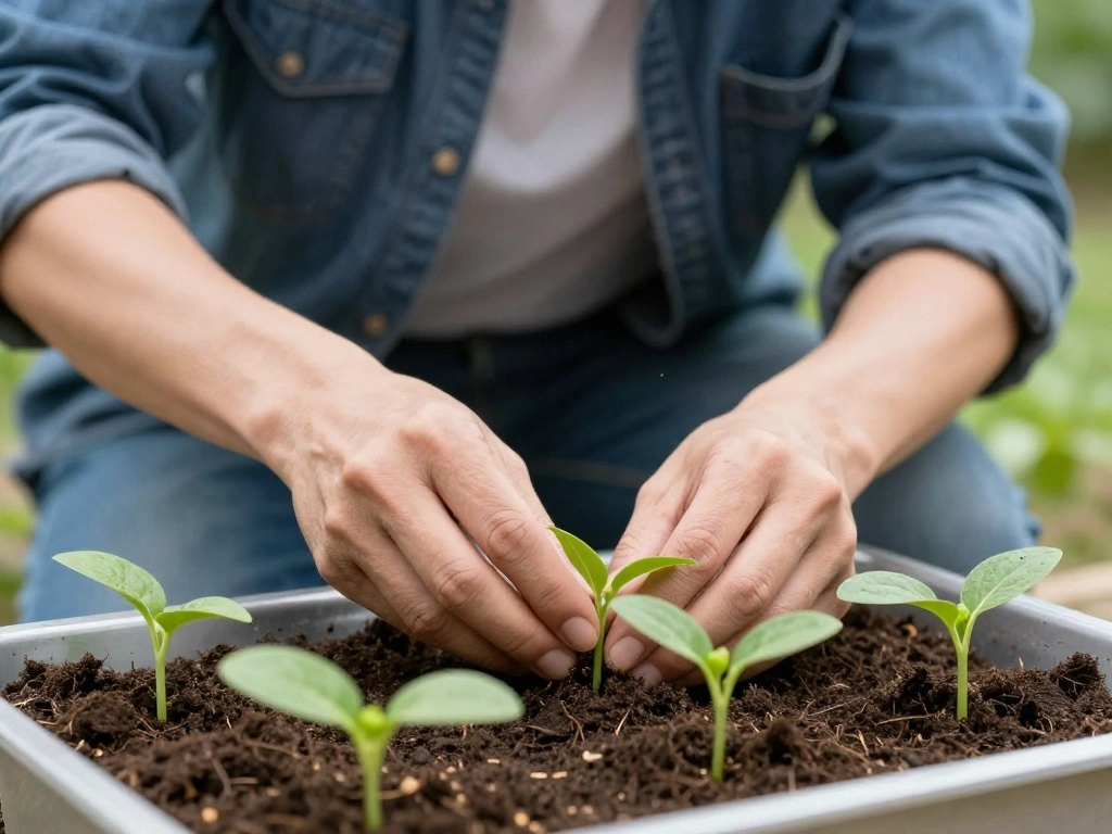 [Image Prompt: Show a gardener carefully planting seedlings into a container filled with soil.]