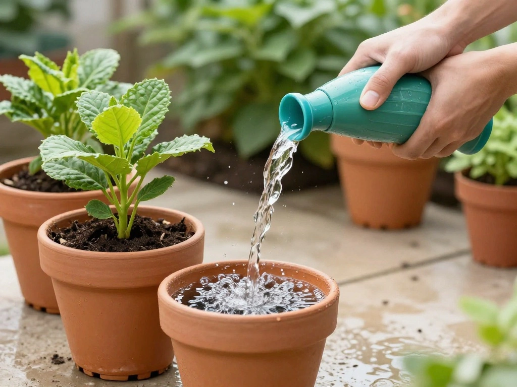 [Image Prompt: Show a gardener watering newly planted pots, with water flowing from the drainage holes.]