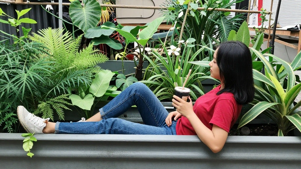 [Image Prompt: Show a person relaxing by their container garden, enjoying the beauty of the plants.]
