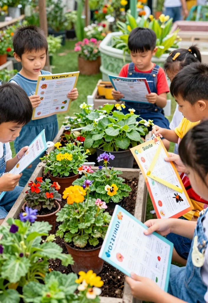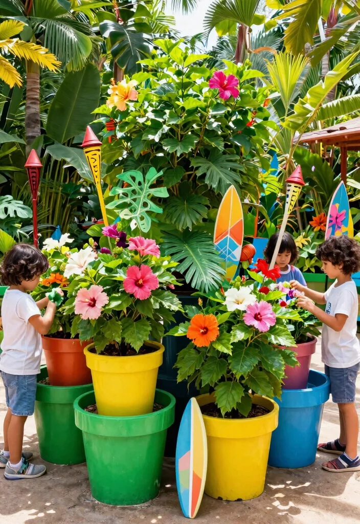 Use colorful pots that match your theme, and introduce plants that flourish in those environments. For instance, vibrant hibiscus and ferns for a tropical garden or succulents and cacti for a desert feel create an engaging learning experience.