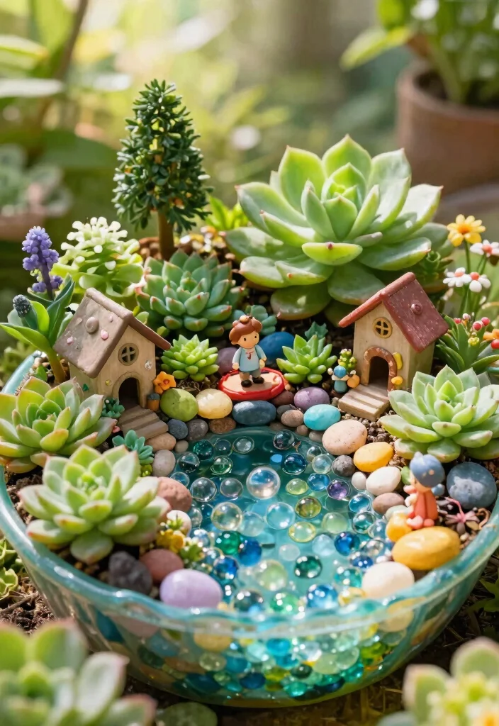 Opt for easy-care plants like succulents or small flower varieties that fit perfectly in little hands. Kids can personalize their gardens with fairy figurines, tiny houses, or even a pond made from colorful glass beads, encouraging creativity as they arrange elements to tell their own stories.