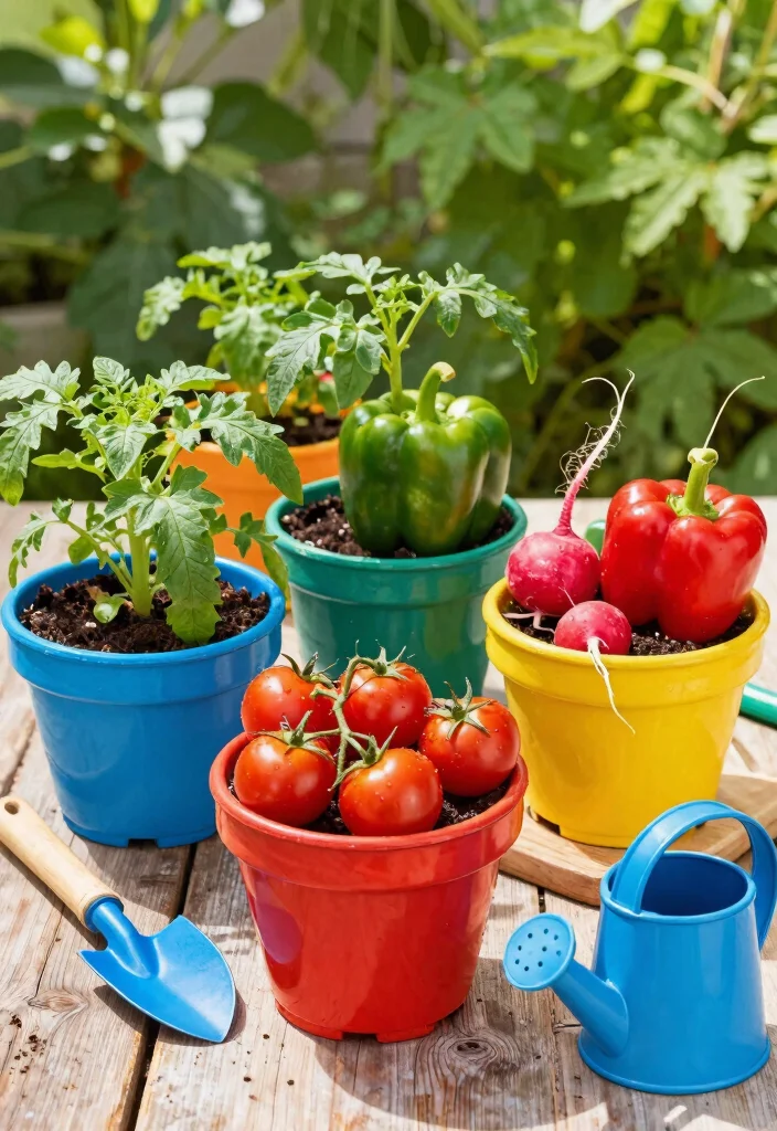 Who says gardening can’t be fun? Brightly colored containers filled with vegetables like cherry tomatoes, peppers, and radishes create an exciting way for kids to learn about healthy eating.