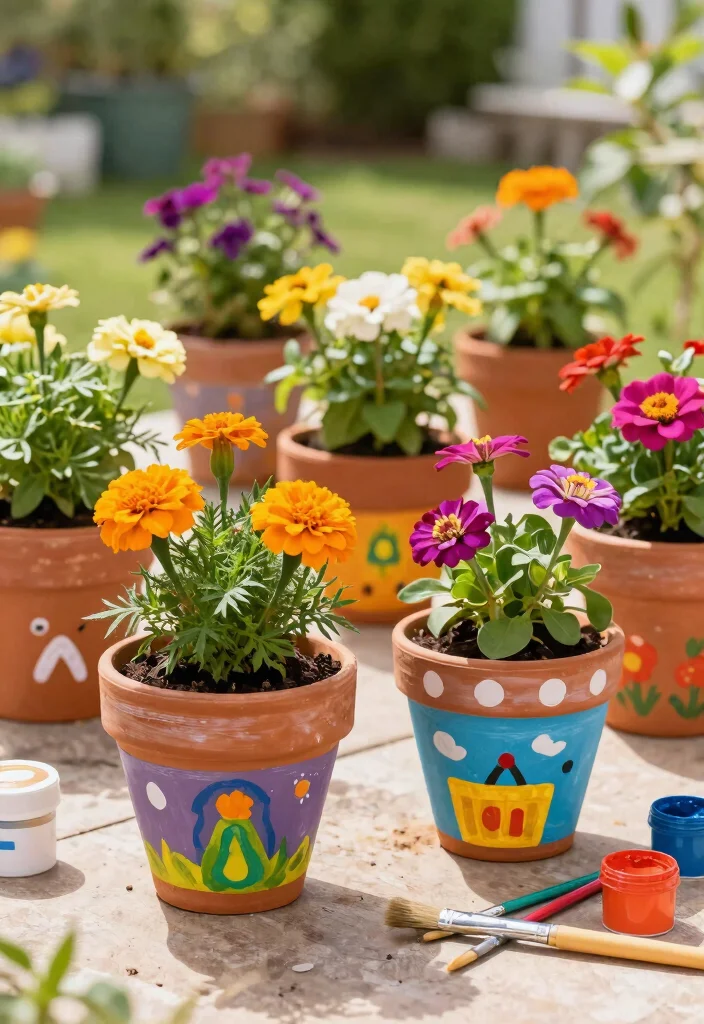 Choose cheerful flowers like marigolds, petunias, or zinnias that will flourish in their colorful creations. This project not only beautifies your garden but also instills a sense of pride in their artistic work, bridging creativity with gardening.