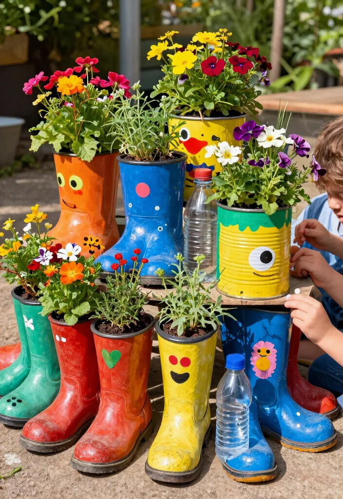 Get creative by turning everyday items like old boots, tin cans, or plastic bottles into fun planters! Kids can decorate these recycled items with paint or markers, transforming them into quirky container gardens that express their style.