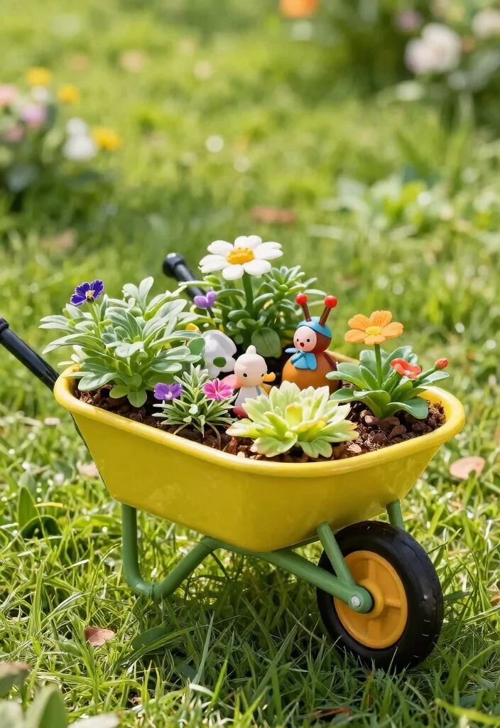 Since the wheelbarrow is mobile, children can easily move their garden to find the perfect spot for sunshine or shade. This creative project allows them to observe how different plants respond to sunlight and water while having fun decorating with small figurines or stones.