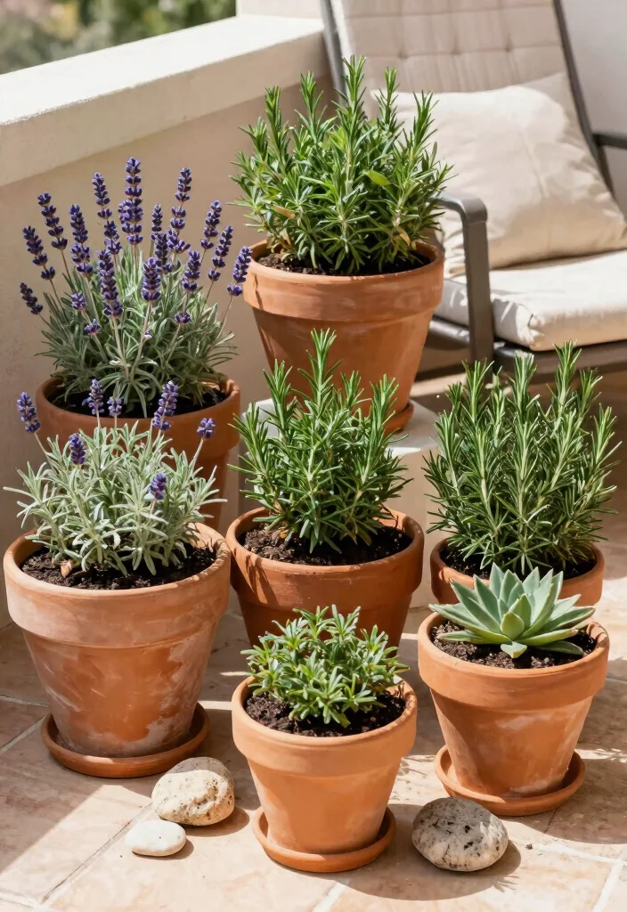 Opt for terracotta containers to enhance Mediterranean aesthetics and regulate soil moisture.