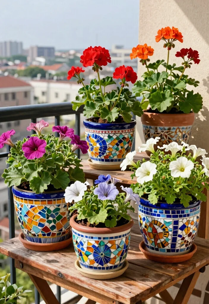 Add artistic flair to your balcony with mosaic-patterned pots. These unique containers not only enhance your garden’s visual appeal but also embody the vibrant culture of Mediterranean regions.