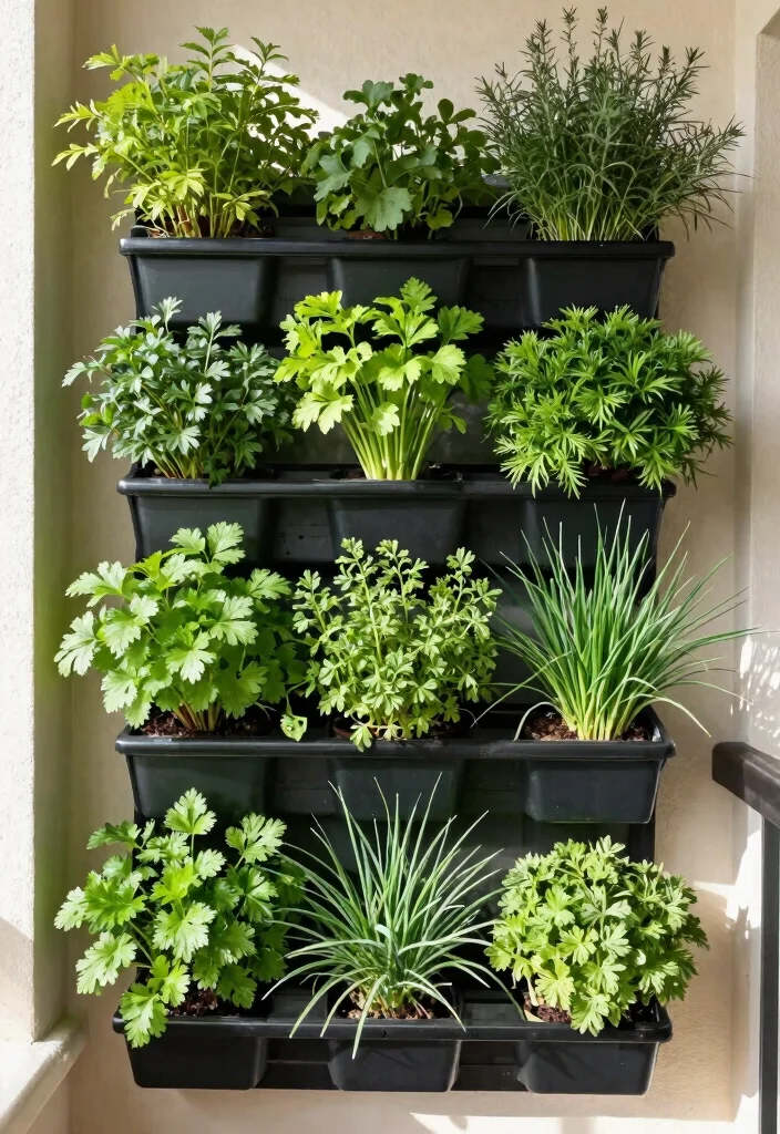 Maximize your balcony space with a vertical herb garden! This clever idea is both space-efficient and visually striking. Use wall-mounted planters or a hanging gutter system to grow Mediterranean herbs, allowing you to enjoy a variety of flavors in limited space.