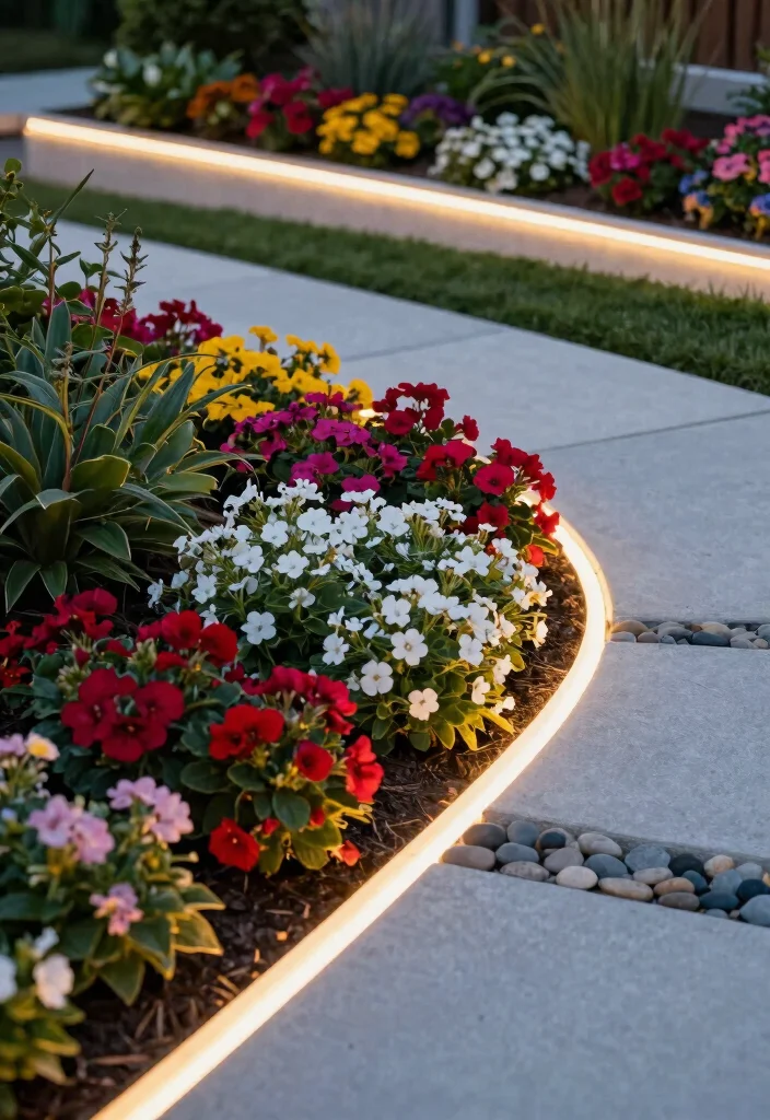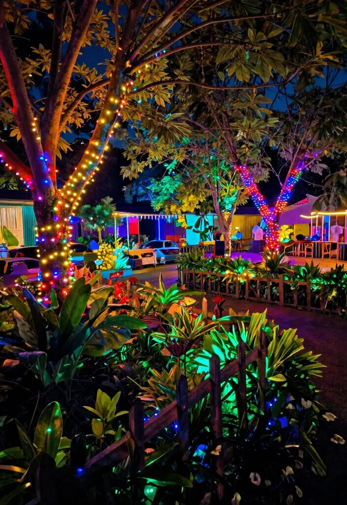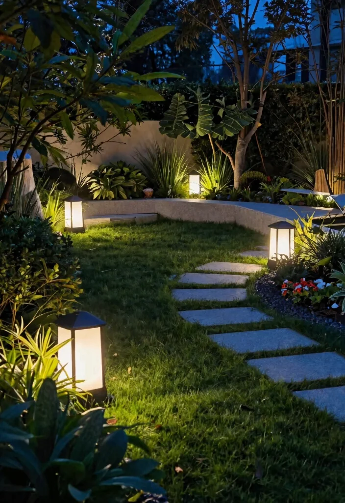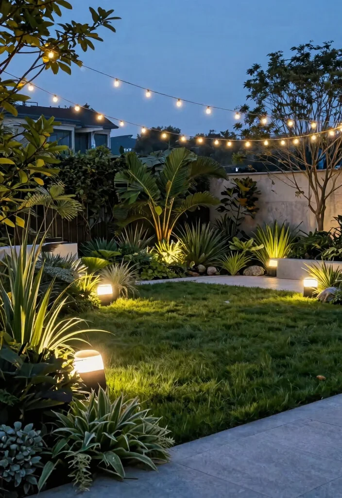 Plan a layered scheme that uses ambient outdoor illumination at the boundaries, along pathways, and around focal plants so you get the most impact with less energy.
