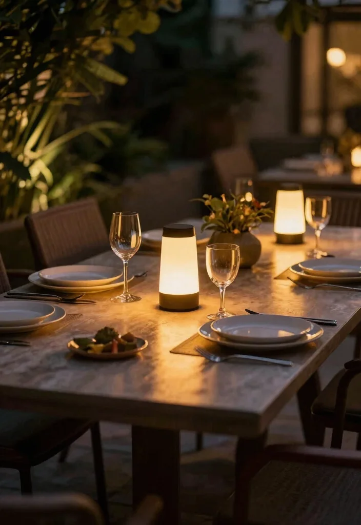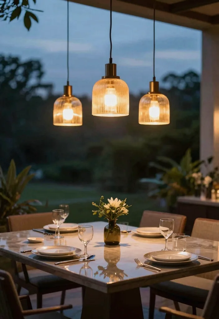 Elevate your outdoor dining experience with hanging pendant lights that blend style and functionality. These fixtures illuminate your table while adding a striking visual element above, perfect for creating an inviting atmosphere. Select materials like metal or glass that complement a modern aesthetic for a cohesive look.