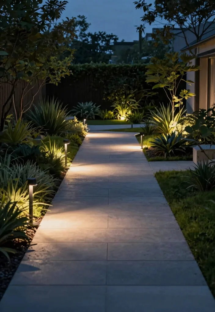 Add a subtle wall wash or stake lights to soften shadows while keeping the look modern and cohesive.