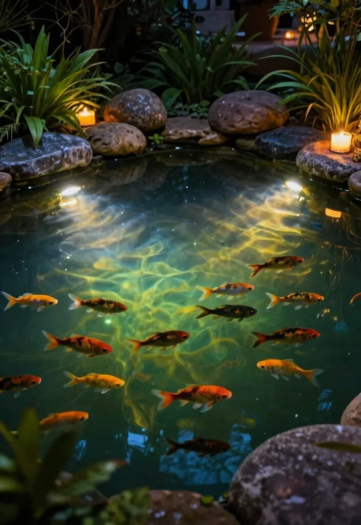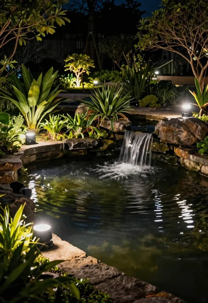 Install underwater lights to create a subtle glow that enhances the beauty of your pond at night.
