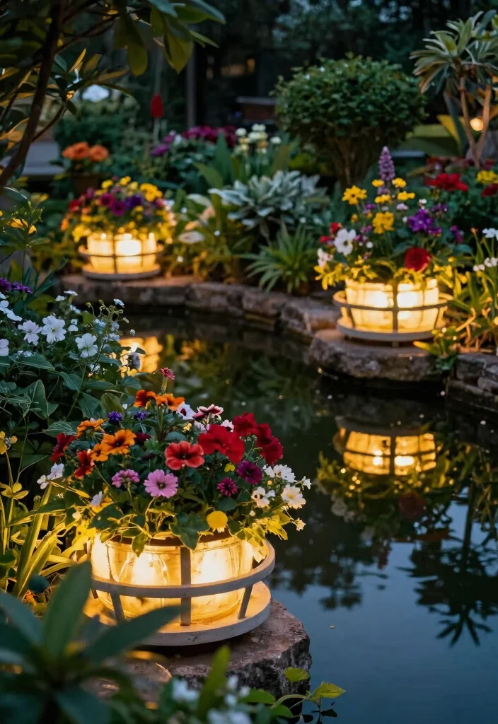 Add floating lanterns for a dreamy effect, making your water feature serene and inviting during evening hours.