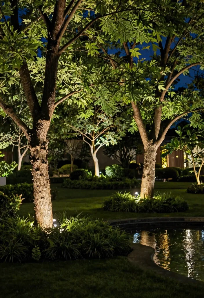 Illuminate the beauty of your trees with uplighting, creating a striking backdrop for your pond area. By positioning spotlights at the base and directing the light upward, you enhance the stunning textures of the bark and leaves, giving depth to your garden. This effect transforms your outdoor space into an inviting and sophisticated retreat.