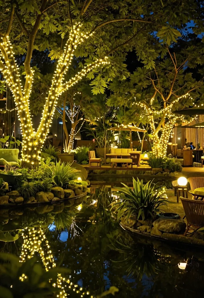 String lights bring a festive ambiance to any outdoor space, and wrapping them around your pond or trees adds a touch of magic. Whether you choose classic white or colorful lights, these twinkling bulbs create warmth and charm, making your garden inviting.
