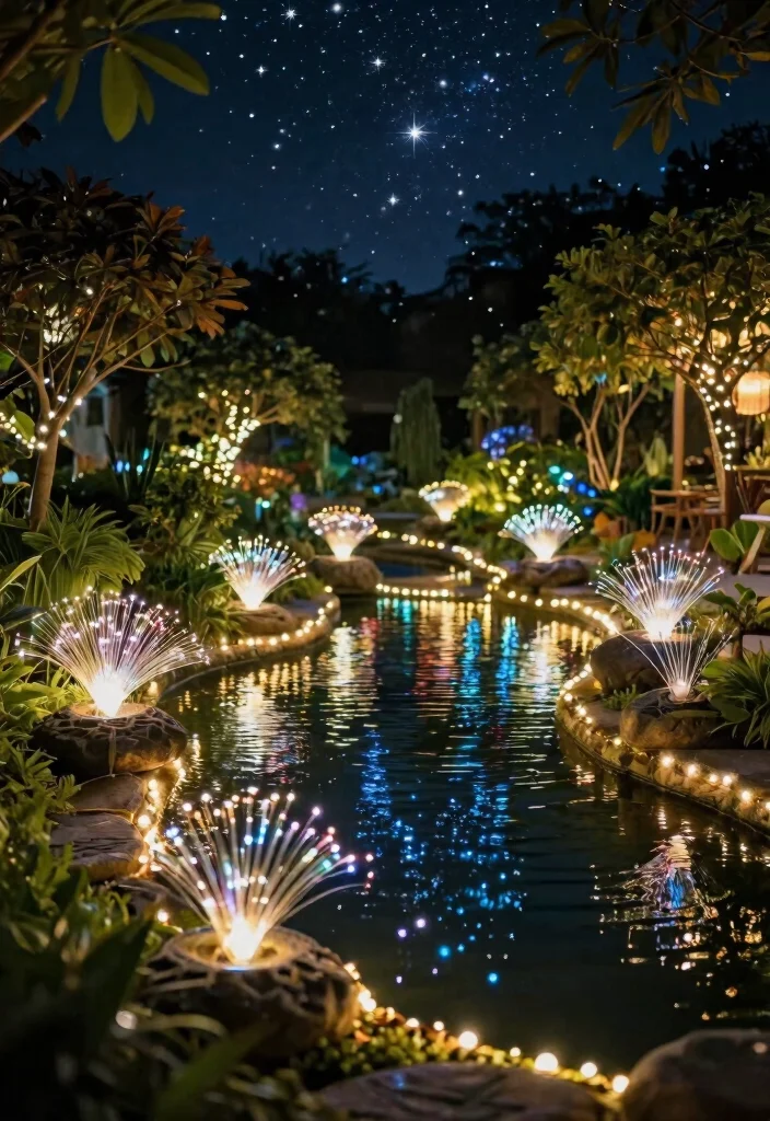 Incorporate fiber optic lights for a starry effect, offering a unique and magical ambiance around your water features.