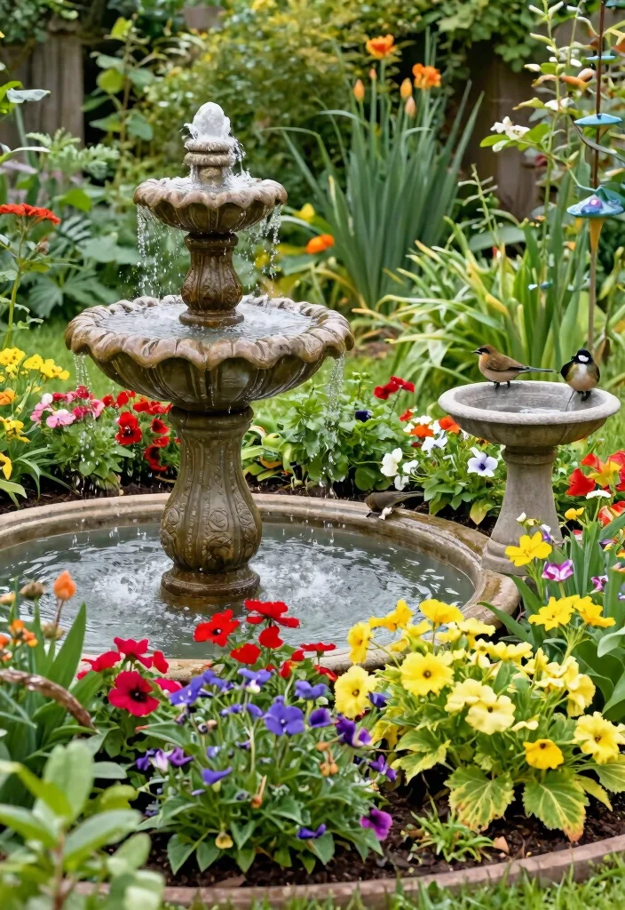 Choose a suitable location for your water feature that complements your garden design. Select a fountain or birdbath that fits your style, ensuring it’s distanced enough to protect plant growth.