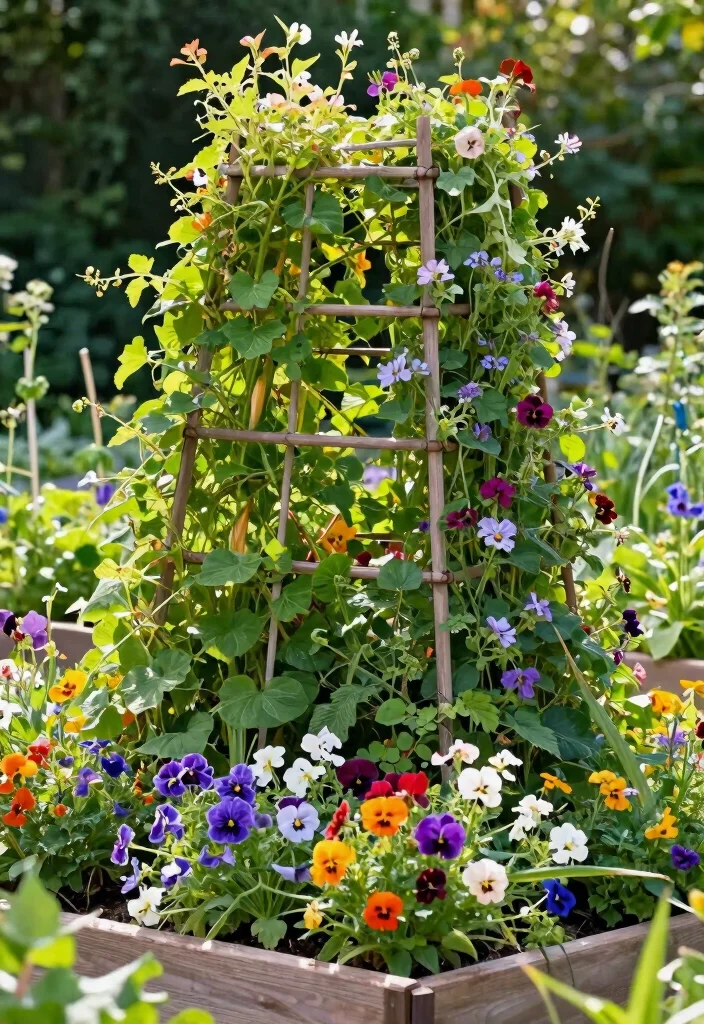 Incorporate climbing flowers like nasturtiums or sweet peas alongside vegetables like cucumbers. This blend not only enhances the garden’s beauty but also attracts beneficial pollinators.