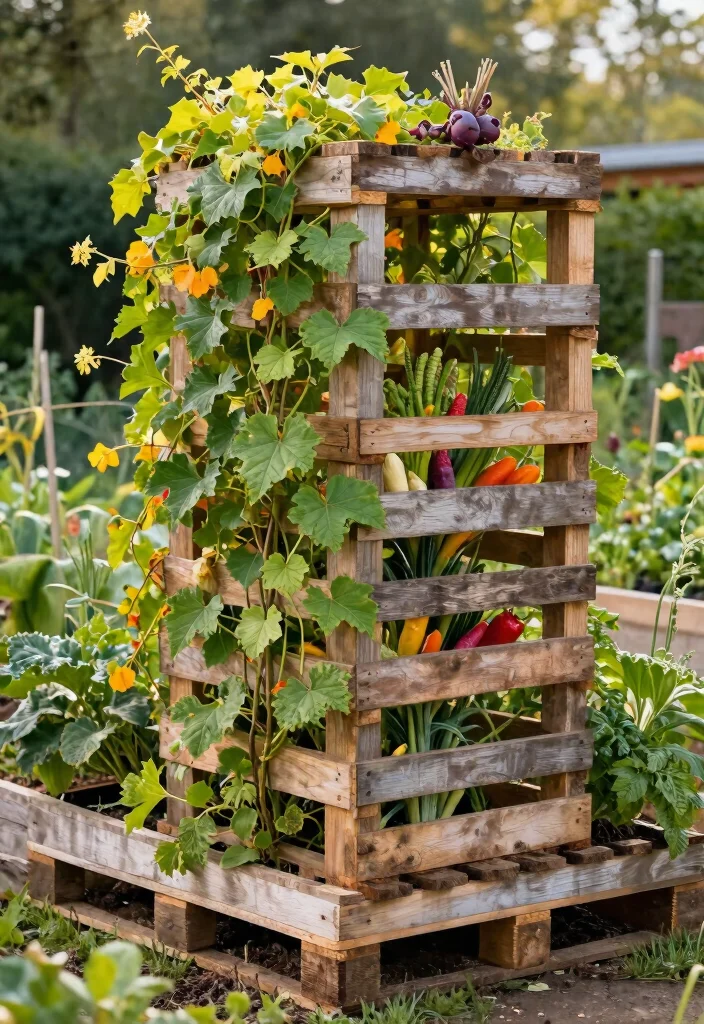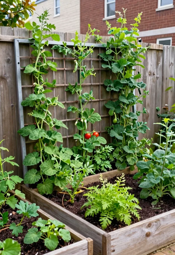 This setup is perfect for climbing vegetables like peas and tomatoes, which thrive even in tight spots.