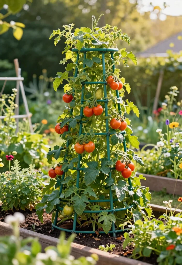Place your circular trellis in the center of the raised bed, encouraging tomatoes and melons to spiral upwards. This allows for easy harvesting from all angles while showcasing your plants’ beauty.