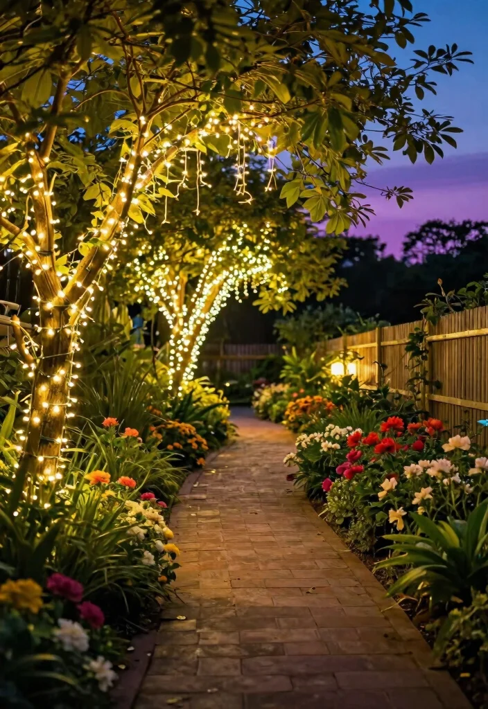 Twinkling fairy lights can turn your garden path into a fairy tale setting. Hang them gracefully along fences, trees, or entrances to create a warm, inviting glow for evening walks. These solar-powered lights are eco-friendly and come in various styles, from warm white to vibrant multicolors, making it easy to match your personal taste.