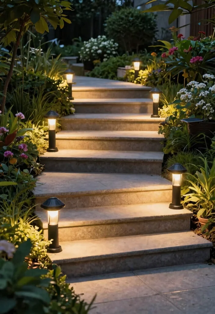 Fun fact: solar step lights sip power from daylight, using up to 80% less energy than wired LEDs. They fit perfectly into solar garden path lighting ideas, guiding steps safely and creating a magical walkway.