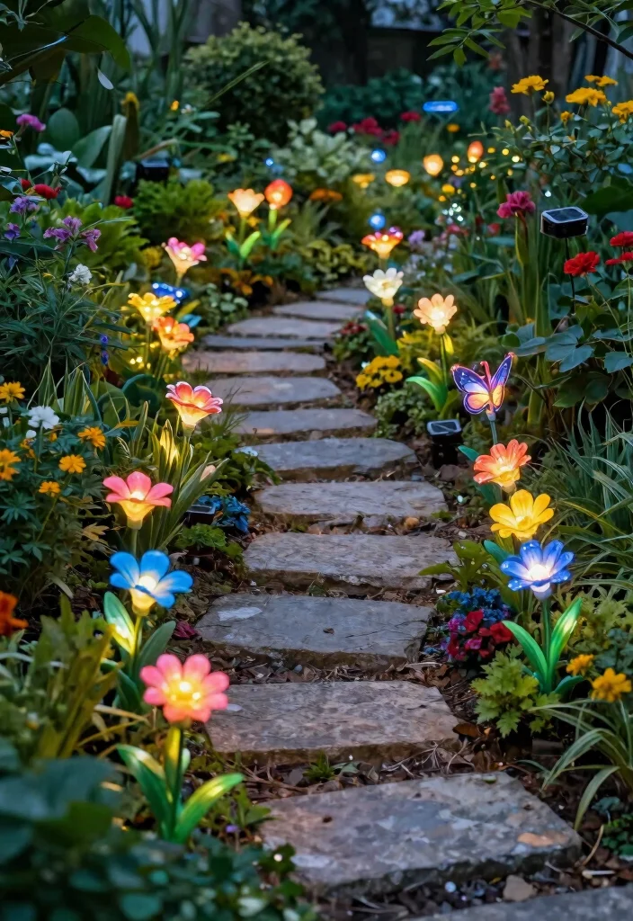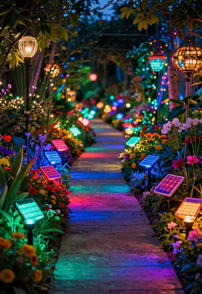 Color-changing solar lights add an element of fun to your garden path. These lights can cycle through different colors or be set to your favorite shades, perfect for celebrations or simply adding flair to your outdoor space.