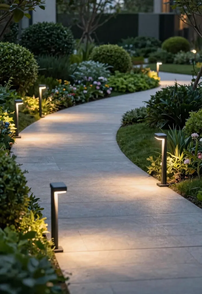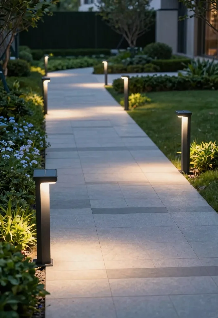 These solar garden path lighting ideas blend beauty with practicality. Start with high-quality outdoor lighting LEDs and solar-powered fixtures that fit your style. For solar garden path lighting ideas, place lights about 6–8 feet apart along the edge of the path, and aim them downward for a soft, diffuse glow. Choose warm white LEDs in the 2700–3000K range to keep the walkway inviting, and mix fixture heights to add depth. Use weatherproof, IP-rated lights, ensure the solar panels aren’t shaded, and weave in garden decor elements like stone borders or stepping stones. This setup gives safety, pathway illumination and energy-efficient lighting with minimal maintenance.