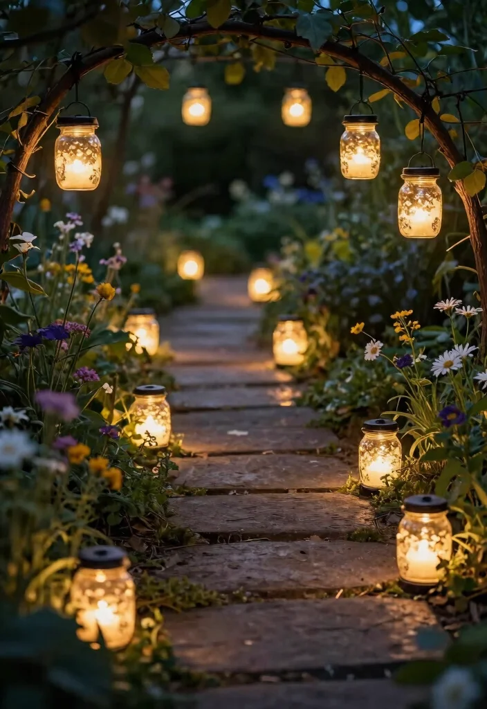 Rustic solar jar lights bring a cozy, vintage vibe to your garden path. You can buy pre-made versions or create your own by placing solar lights inside glass jars. These charming accents can be hung or placed around your walkway, adding a homemade touch to your outdoor space.